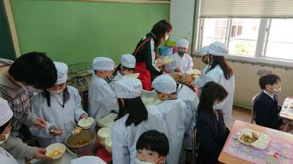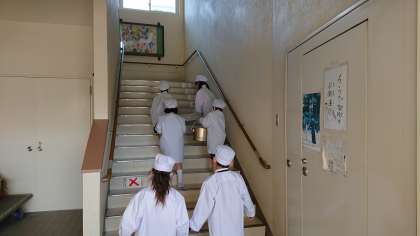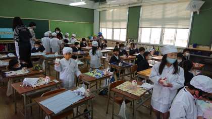 今日から給食が始まりました。1年生の初めて給食の様子です。