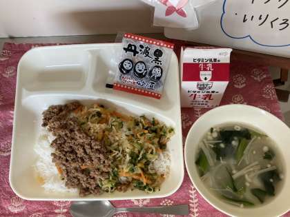今日の給食は、ビビンバ、牛乳、トック、いり黒豆です。