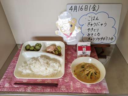 今日の給食は、ごはん、牛乳、焼きとり、みそしる、きゅうりのゆず風味です。
