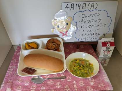 今日の給食は、コッペパン、牛乳、煮込みハンバーグ、コーンスープ、焼きかぼちゃ、いちごジャムです。