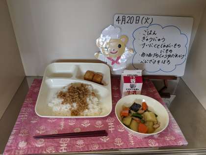 今日の給食は、ごはん、牛乳、鶏肉とじゃがいもの煮もの、あつあげのしょうゆだれかけ、紅ざけそぼろです。