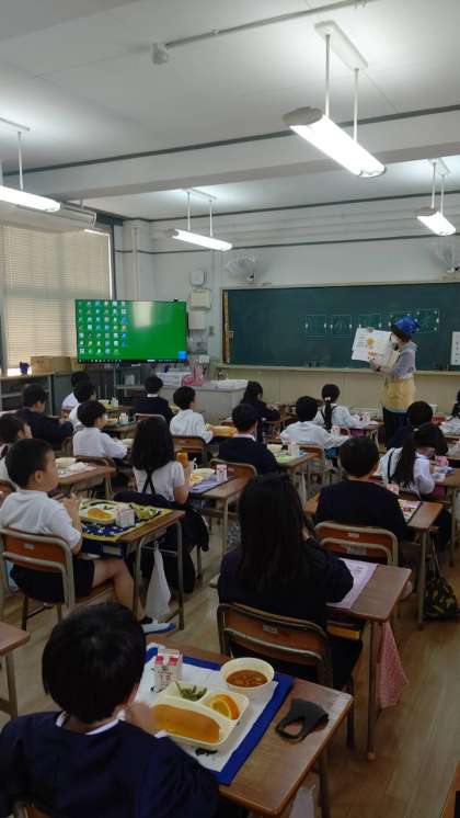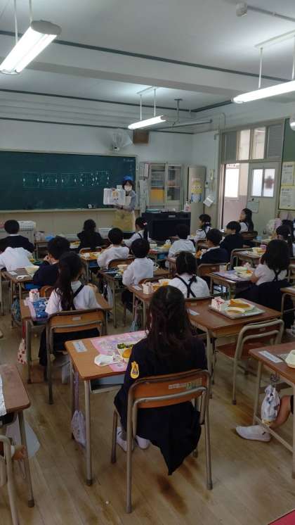 1年生の教室では、あまなつかんの皮むきについて栄養教諭が指導しました。
