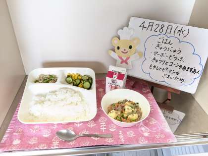 今日の給食は、ごはん、牛乳、マーボーどうふ、きゅうりとコーンの甘酢あえ、もやしとピーマンのごまいためです。