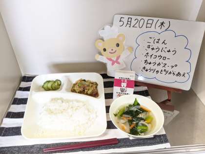 今日の給食は、ごはん、牛乳、ホイコウロー、中華スープ、きゅうりのピリ辛あえです。