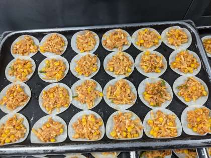 変わりピザは、ツナ缶、コーン、ピーマン、ピザソース、チーズを混ぜ合わせて、ぎょうざの皮の上にのせ、焼き物機で焼きました。