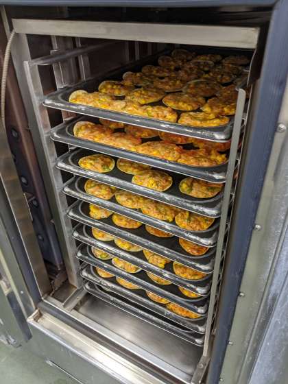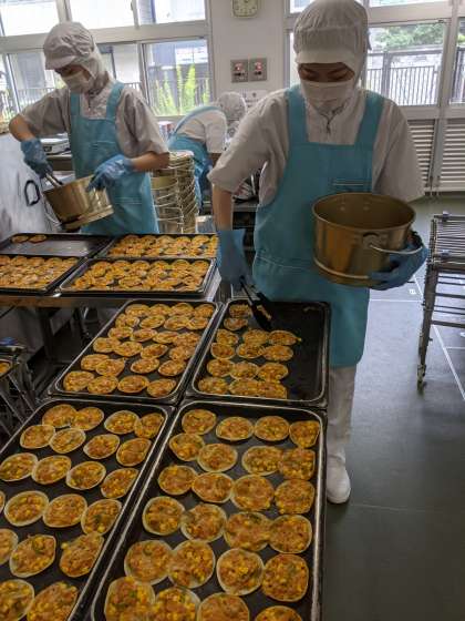 また、焼きあがったピザを各クラスの人数分数えて食缶に入れるのも給食調理員さん2名で30分かけて行っていました。