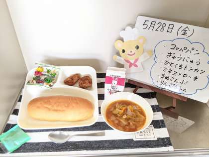 今日の給食は、コッペパン、牛乳、一口トンカツ、ミネストローネ、豆こんぶ、りんごジャムです。
