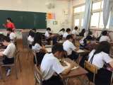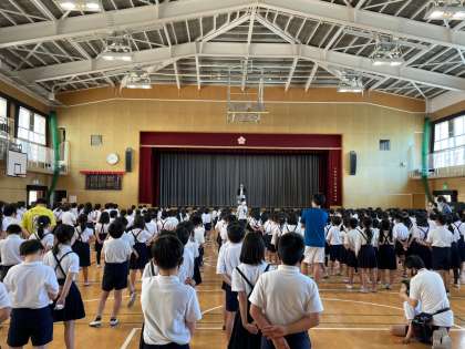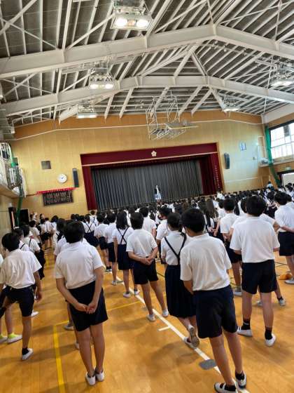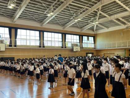 体育館で学校長から話を聞き、学級へ帰って担任からも指導を受けました。感じたことや、自分が何をすべきかということについて考え、2年生以上は作文に書きました。1年生は、自分の考えを発表しました。