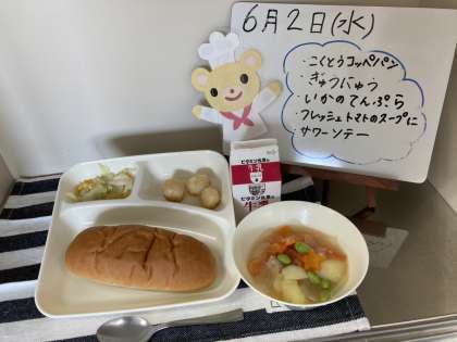 6月2日の給食は、黒糖パン、牛乳、いかてんぷら、フレッシュトマトのスープ煮、サワーソテーです。