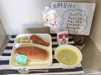 今日の給食は、コッペパン、牛乳、サーモンフライ、豆乳スープ、キャベツのソテー、りんごジャムです。