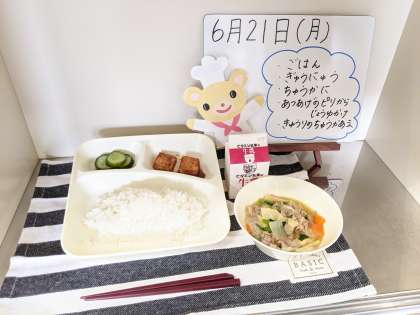今日の給食は、ごはん、牛乳、中華煮、あつあげのピリ辛じょうゆかけ、きゅうりの中華あえです。