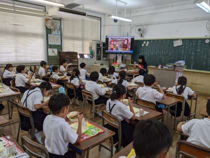 あつあげのピリ辛じょうゆかけは、焼き物機で焼いたあつあげに砂糖、こいくちしょうゆ、トウバンジャンを合わせたタレをかけました。3年2組の教室では、「おいしいー」と大好評で、おかわりの列ができていました。
