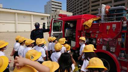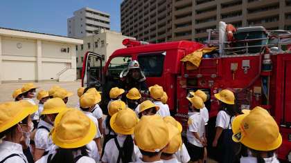 1年生は訓練の後、消防車の見学をさせていただきました。
