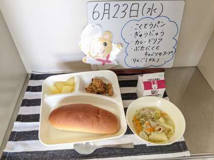 今日の給食は、黒糖パン、牛乳、カレードリア、豚肉とキャベツのスープ、りんご(かんづめ)です。