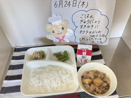 今日の給食は、ごはん、牛乳、すき焼き煮、オクラのかつお梅風味、もやしとピーマンのごまいためです。