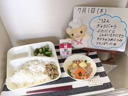 今日の給食は、ごはん、牛乳、豚肉とじゃがいもの煮もの、オクラの梅風味、ツナっ葉いためです。