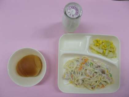 今日の献立は「クリームスパゲッティ、キャベツとコーンのサラダ」でした。
