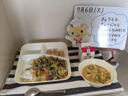 今日の給食は、牛丼、牛乳、とうがんのみそ汁、白花豆の煮ものです。