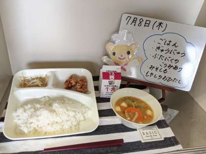 今日の給食は、ごはん、牛乳、豚肉の香味あげ、みそ汁、もやしのおひたしです。