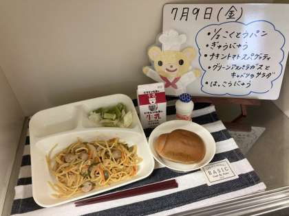 今日の給食は、1/2黒糖パン、牛乳、チキントマトスパゲッティ、グリーンアスパラガスとキャベツのサラダ、発酵乳です。
