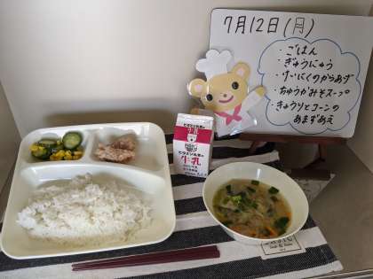 今日の給食は、ごはん、牛乳、鶏肉のからあげ、中華みそスープ、きゅうりとコーンの甘酢あえです。