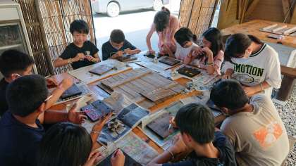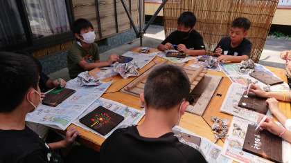 休憩の後、昨日磨いた焼き板に、絵や文字をかきました。
