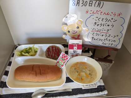 今日の給食は、黒糖パン、牛乳、ハンバーグ、豆乳スープ、キャベツとピーマンのカレーソテーです。