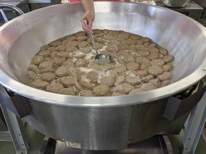 今日の給食は、焼き物機の不具合により、焼きハンバーグからハンバーグに変更になりました。焼き物機で焼くところを釜で煮て作りました。