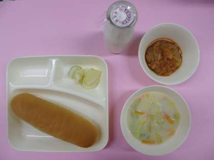 今日の献立は「煮込みハンバーグ、豆乳コーンスープ、焼きじゃが」でした。