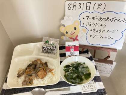 今日の給食は、マーボーあつあげ丼、牛乳、中華スープ、ミニフィッシュです。