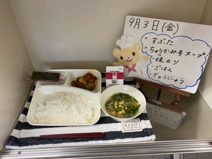 今日の給食は、ごはん、牛乳、酢豚、中華みそスープ、焼きのりです。