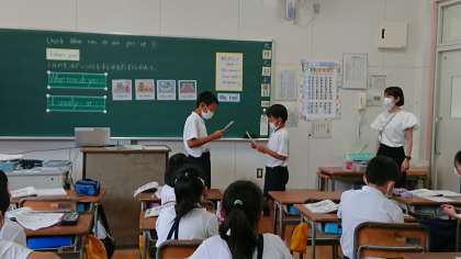 今日は、5年生で「What time do you get up ?」の単元の公開授業をしました。