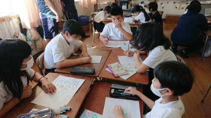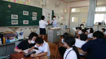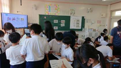 今日は、4年生で「What time is it?」の単元の公開授業をしました。