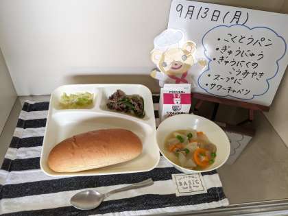 13日の給食は、黒糖パン、牛乳、牛肉の香味焼き、スープ煮、サワーキャベツでした。