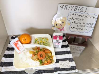 今日の給食は、チキンカレーライス(米粉)、牛乳、キャベツとコーンのサラダ(ノンエッグドレッシング)、冷凍みかんです。