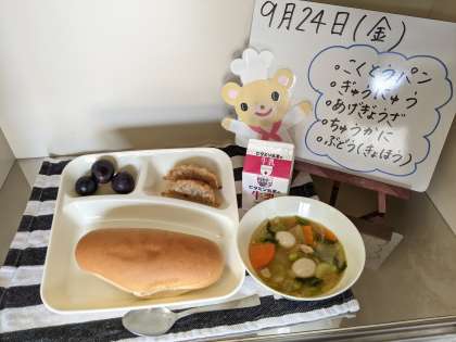 今日の給食は、黒糖パン、牛乳、あげぎょうざ、中華煮、ぶどう(巨峰)です。