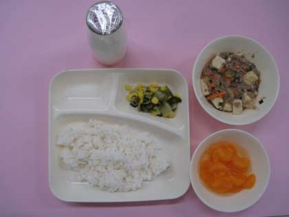 今日の献立は「マーボーどうふ、チンゲンサイとコーンの中華あえ、みかん(かんづめ)」でした。