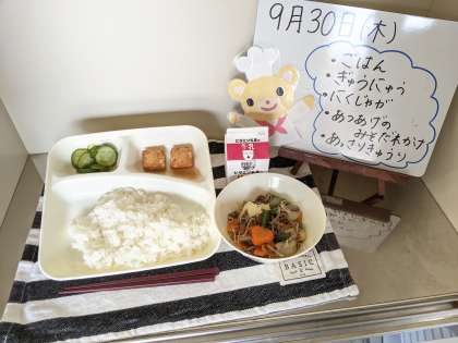 今日の給食は、ごはん、牛乳、肉じゃが、あつあげのみぞれがけ、あっさりきゅうりです。