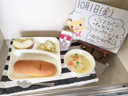 今日の給食は、黒糖パン、牛乳、コーンクリームシチュー(米粉)、はくさいのピクルス、りんごです。