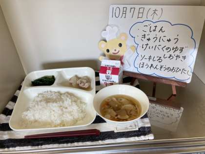 今日の給食は、ごはん、牛乳、鶏肉のゆず塩焼き、ソーキ汁、ほうれんそうのおひたしです。