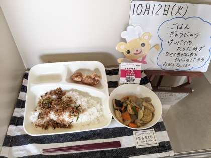 今日の給食は、ごはん、牛乳、鶏肉のたつたあげ、一口がんもと野菜の煮もの、おかかなっ葉です。