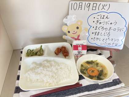 今日の給食は、ごはん、牛乳、まぐろのオーロラ煮、すまし汁、もやしとピーマンのいためものです。
