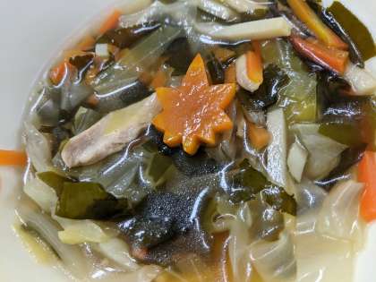 すまし汁は、こんぶとかつお節で出汁をとっています。給食調理員さんが、もみじのラッキーにんじんを入れてくださいました。