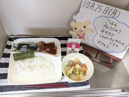 今日の給食は、ごはん、牛乳、みそカツ、じゃがいもと野菜の煮もの、焼きのりです。