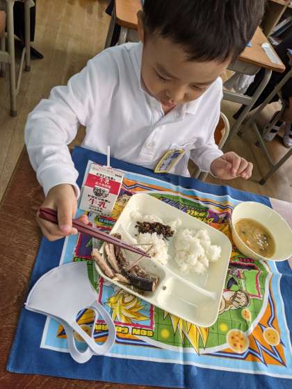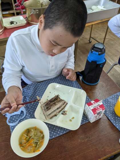 1・2年生は栄養教諭より、さんまの上手な食べ方を学びました。上手に骨をとって食べられました。