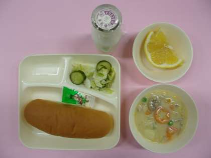 今日の献立は「コーンクリームシチュー、グリーンサラダ、河内ばんかん」でした。