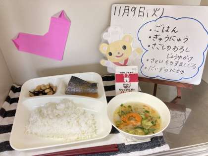 今日の給食は、ごはん、牛乳、さごしのおろしじょうゆかけ、さといものすまし汁、大豆の煮ものです。
