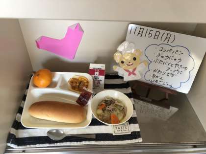 今日の給食は、コッペパン、牛乳、豚肉と野菜のスープ煮、変わりピザ、みかん、いちごジャムです。