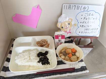 今日の給食は、ごはん、牛乳、関東煮、れんこんの梅風味焼き、のりのつくだ煮です。