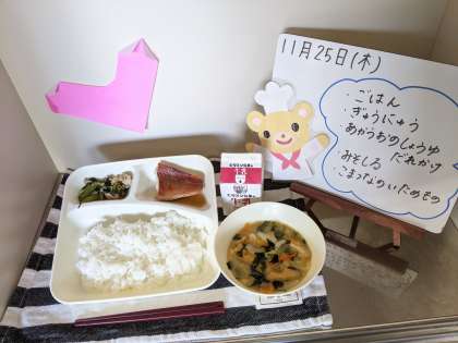 今日の給食は、ごはん、牛乳、あおうおのしょうゆだれかけ、みそ汁、こまつなのいためものです。
